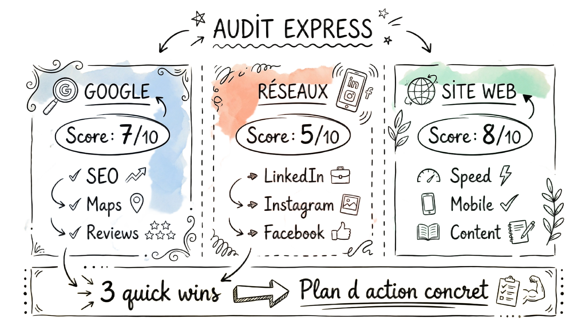 Score your online presence in 10 minutes — Google, social media, and website — with 3 quick wins to fix today.